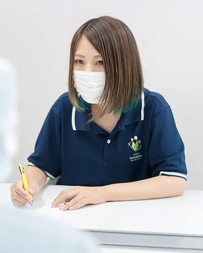 普段心掛けているのは、みんなが気持ちよく働けるように一人ひとりを注意深く見ることです。気分や体調、悩みなどを自分から発信できる方は少ないので、挨拶や表情、顔色などをよく観察します。そういう時、接客の経験が役に立っているなと感じますね。機嫌がいい・悪いがなんとなく分かります。以前利用者様を見ていて、作業に集中できておらず口調もきつくなっているなと感じたことがありました。そこで仕事を中断し話を聞いたところ、他の人とのやりとりでイライラすることがあったそう。話が終わった後は「すっきりした。なんでイライラしとるってわかったん?」と落ち着いた様子で作業に戻ることができていました。ちょっとした変化に気づけたことで、利用者様が前向きな気持ちで働けるようになれた時、やりがいを感じますね。