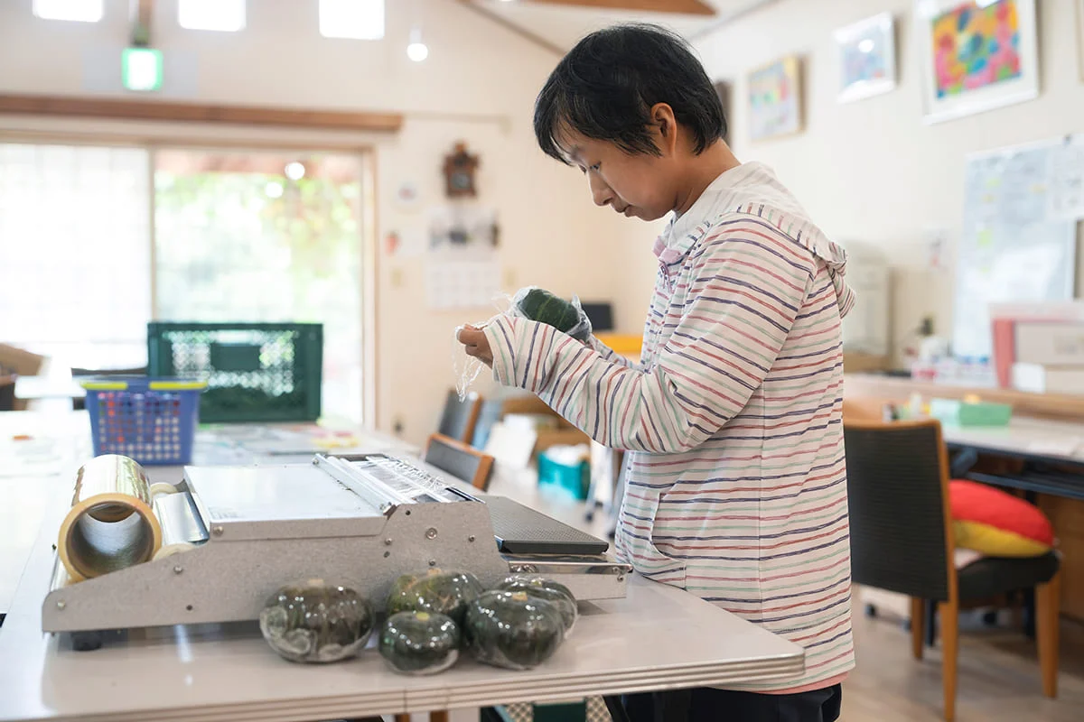 作業の中でも農業は、「楽しい」と話す利用者様が多いです。楽しいからこそ積極的に取り組み、作業を通じて成長している姿が見られます。20反(約2万㎡)の畑があり、栗や椎茸は約5,000~6,000本規模。ほかにもたくさんの作物を栽培しており、法人内の給食として多くの人に喜ばれています。今後に向けてブルーベリー農園や観光農園、農業体験イベントなどを準備中。さらに力を入れていく予定です。