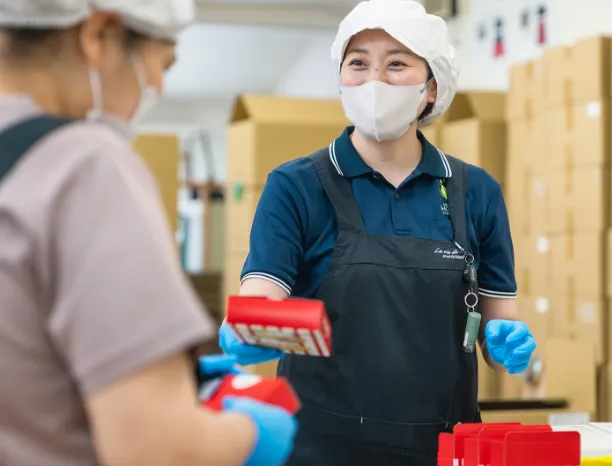 普段心掛けているのは、みんなが気持ちよく働けるように一人ひとりを注意深く見ることです。気分や体調、悩みなどを自分から発信できる方は少ないので、挨拶や表情、顔色などをよく観察します。そういう時、接客の経験が役に立っているなと感じますね。機嫌がいい・悪いがなんとなく分かります。以前利用者様を見ていて、作業に集中できておらず口調もきつくなっているなと感じたことがありました。そこで仕事を中断し話を聞いたところ、他の人とのやりとりでイライラすることがあったそう。話が終わった後は「すっきりした。なんでイライラしとるってわかったん?」と落ち着いた様子で作業に戻ることができていました。ちょっとした変化に気づけたことで、利用者様が前向きな気持ちで働けるようになれた時、やりがいを感じますね。